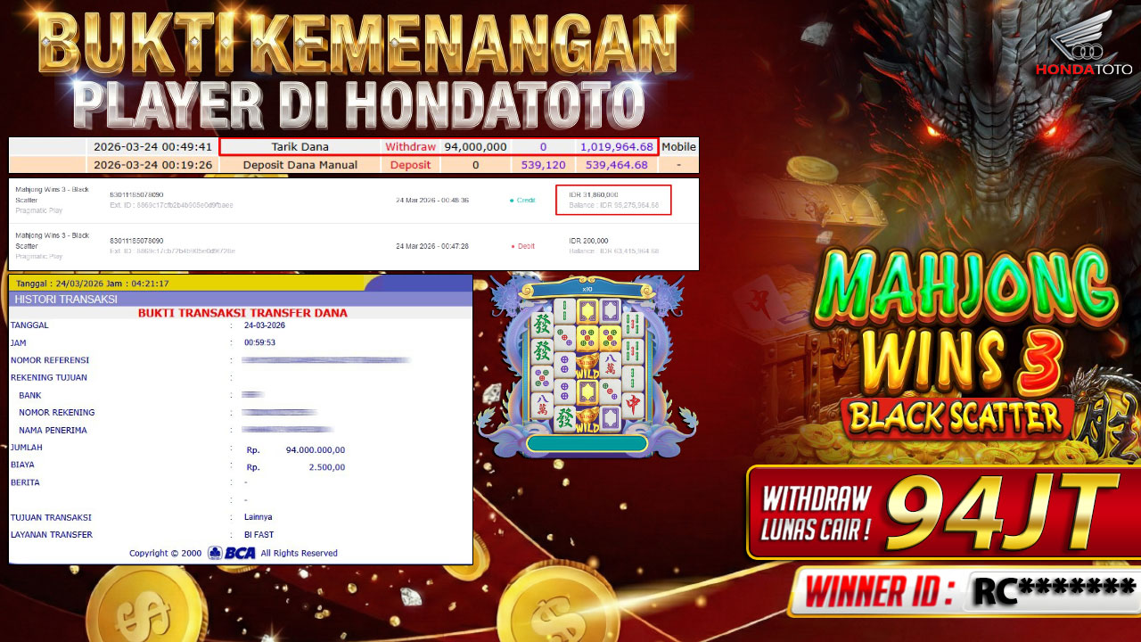Bukti Kemenangan 24 MARET 2026 Di MAHJONG WINS 3 BLACK SCATTER WD 94 Juta